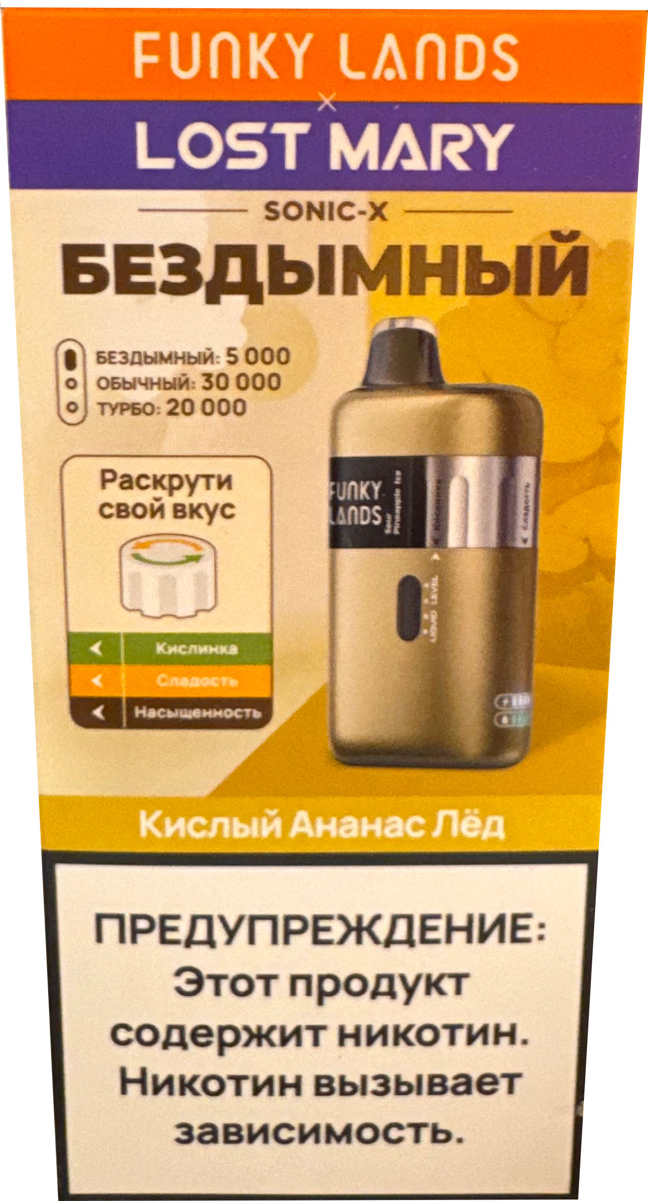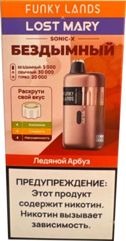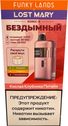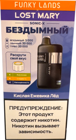 Fanky Lands & Lost Mary Sonic X Кислый Ананас Лед вобрала в себя баланс сладкого и кислого оттенков тропического ананаса, дополненного лёгким ледяным акцентом. English variant of flavor — Sour Pineapple Ice — раскрывает ту же композицию в международной интерпретации. При затяжке ощущается прохлада и сладость, плавно переходящая в мягкое послевкусие. Устройство рассчитано примерно на 30000 затяжек, оснащено ёмким аккумулятором на 600 мА·ч и функцией Type-C зарядки. Оно подходит тем, кто ценит надёжную конструкцию, чистый вкус и простоту использования. Купить данную электронку можно по отличной цене, а её компактный формат идеально подойдёт как для новичков, так и для опытных вейперов.